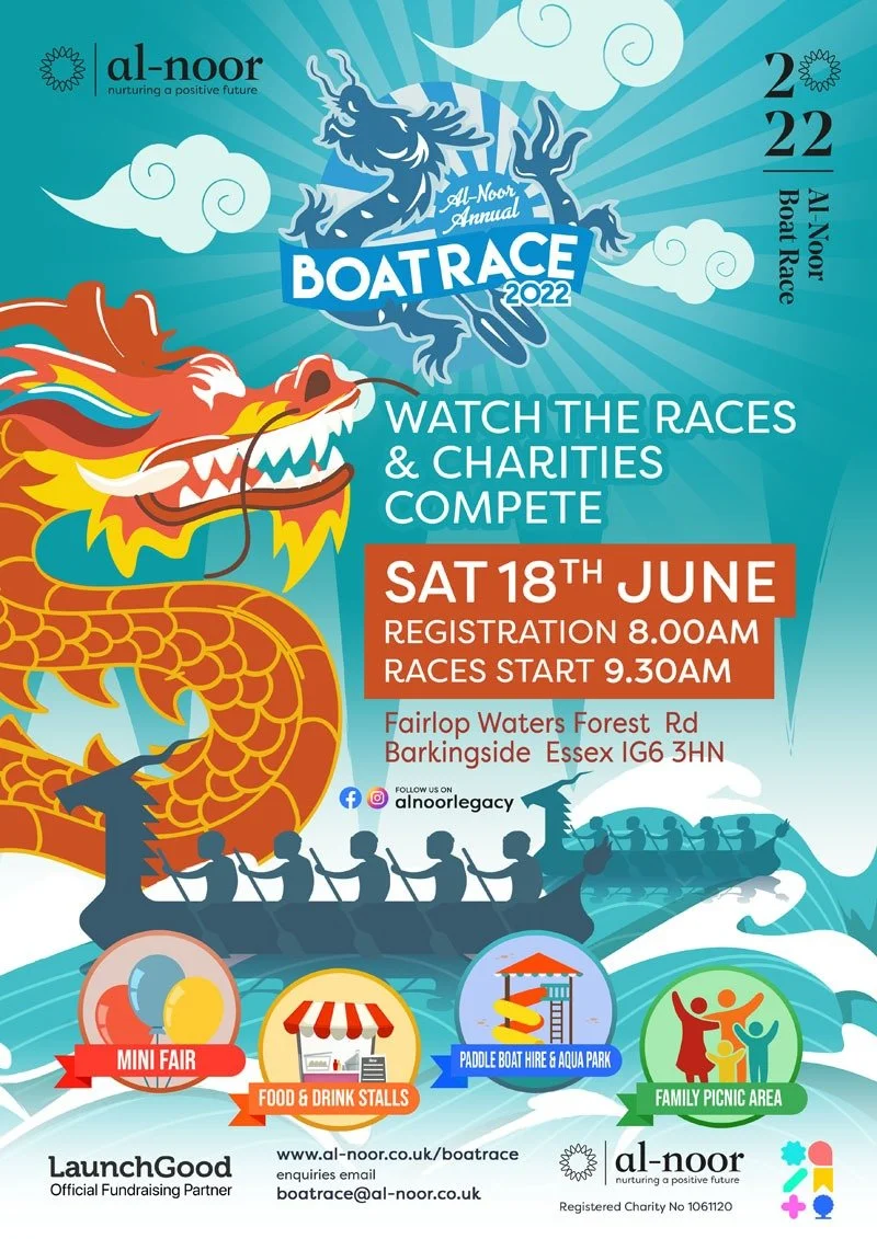 It was a wonderful day of dedication, exhaustion, hard work, positive mindset, a winning attitude and team work this year at the Al-Noor annual dragon Boat Race 2022, which was held at the beautiful landscape of Fairlop Waters, Hainault. This annual event saw over 180 teams participating, over £500K raised and more than 50 registered charities, all who came together to compete in support for noble causes.
